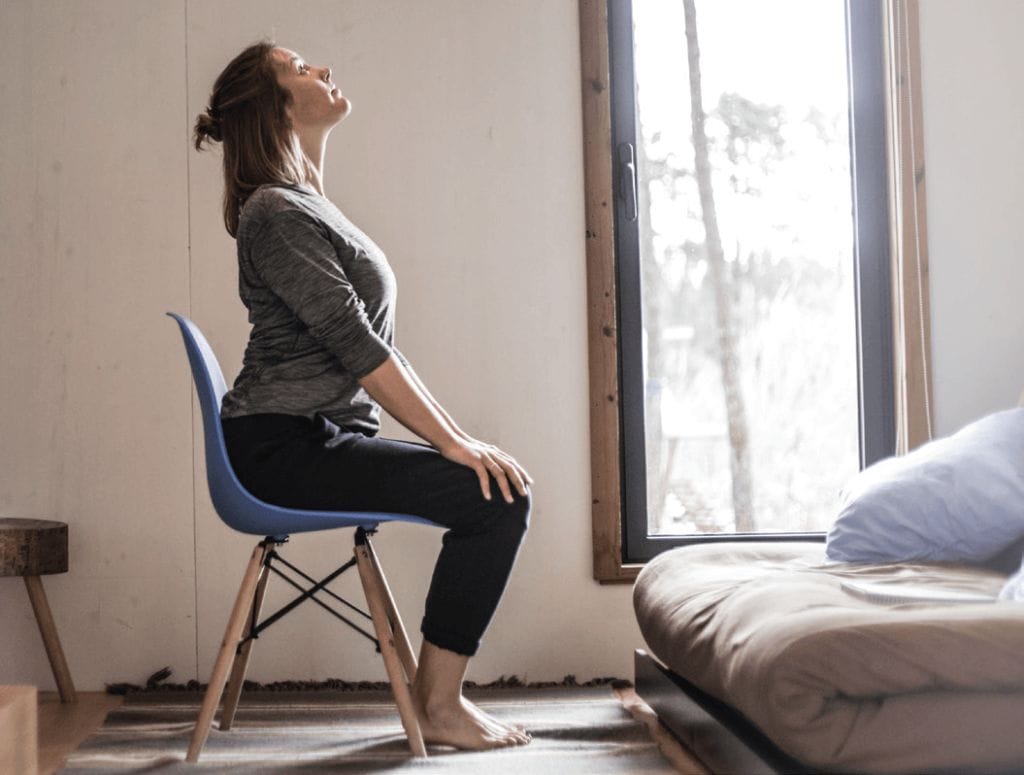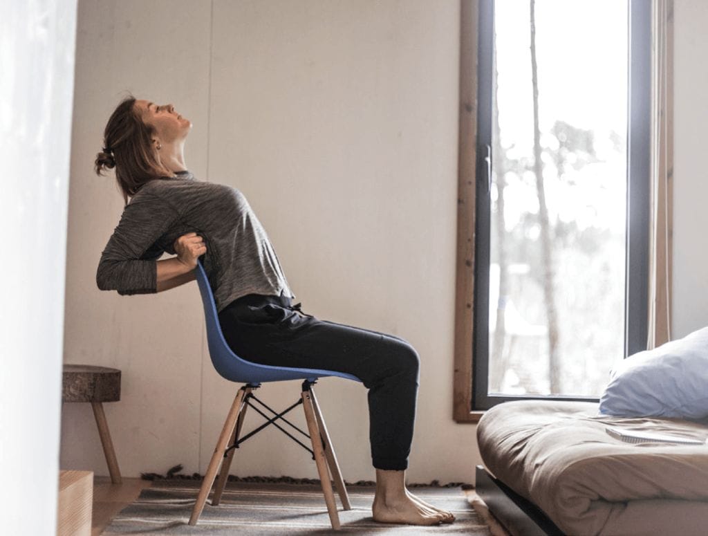 - Brustwirbelsäule nach hinten über Stuhllehne beugen