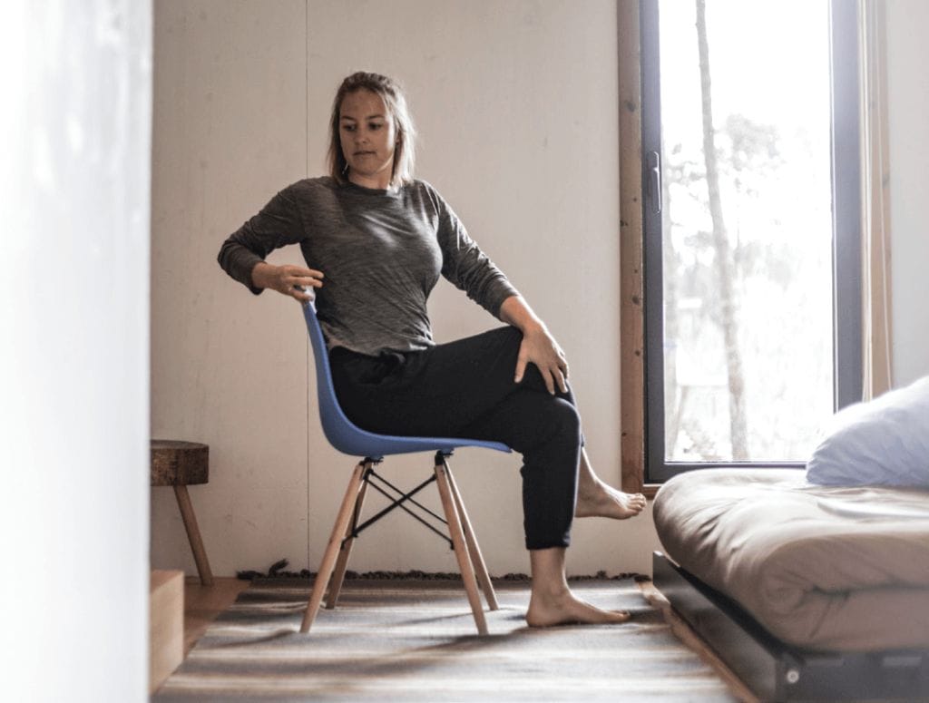 - Drehung verstärken durch Zug an Knie und Stuhllehne