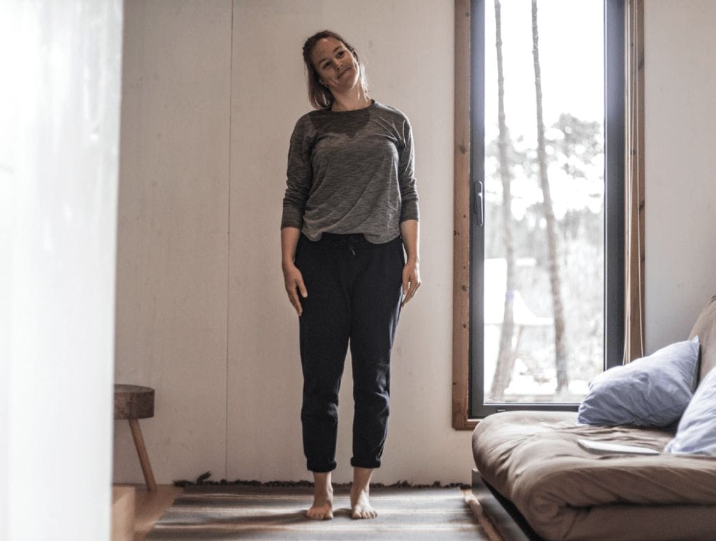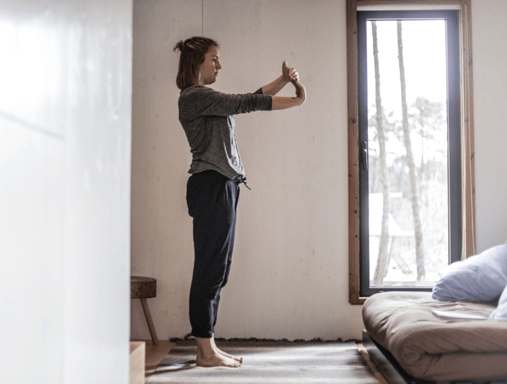 Bevor wir beginnen, solltest du kontrollieren, dass du aufrecht stehst. Führe die Übungen immer kontrolliert, langsam und schmerzfrei durch. Halte die Endstellung jeweils für einige Sekunden oder solange angenehm und atme währenddessen ruhig. Höre dabei auf deinen Körper und versuche nichts zu erzwingen.