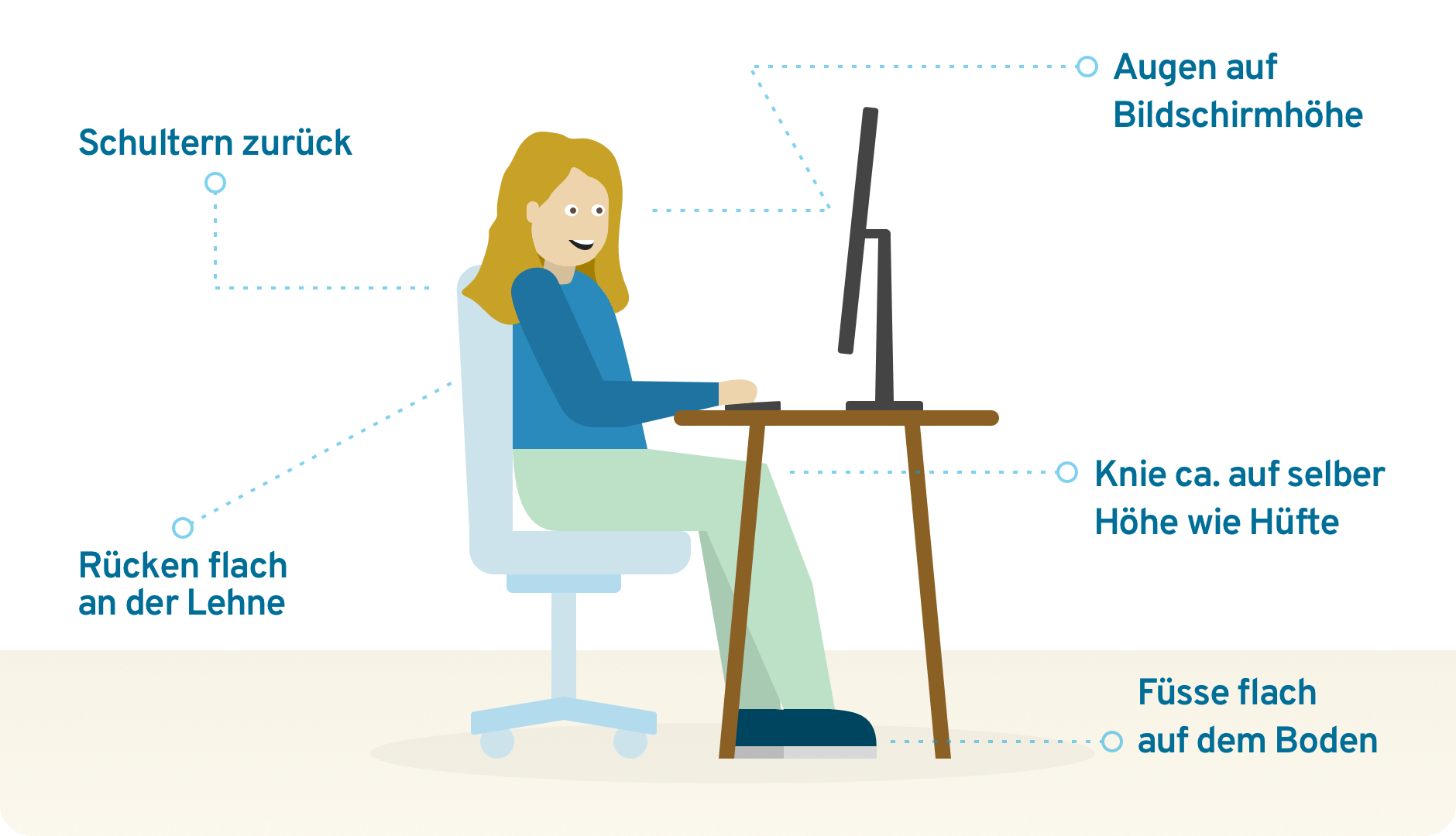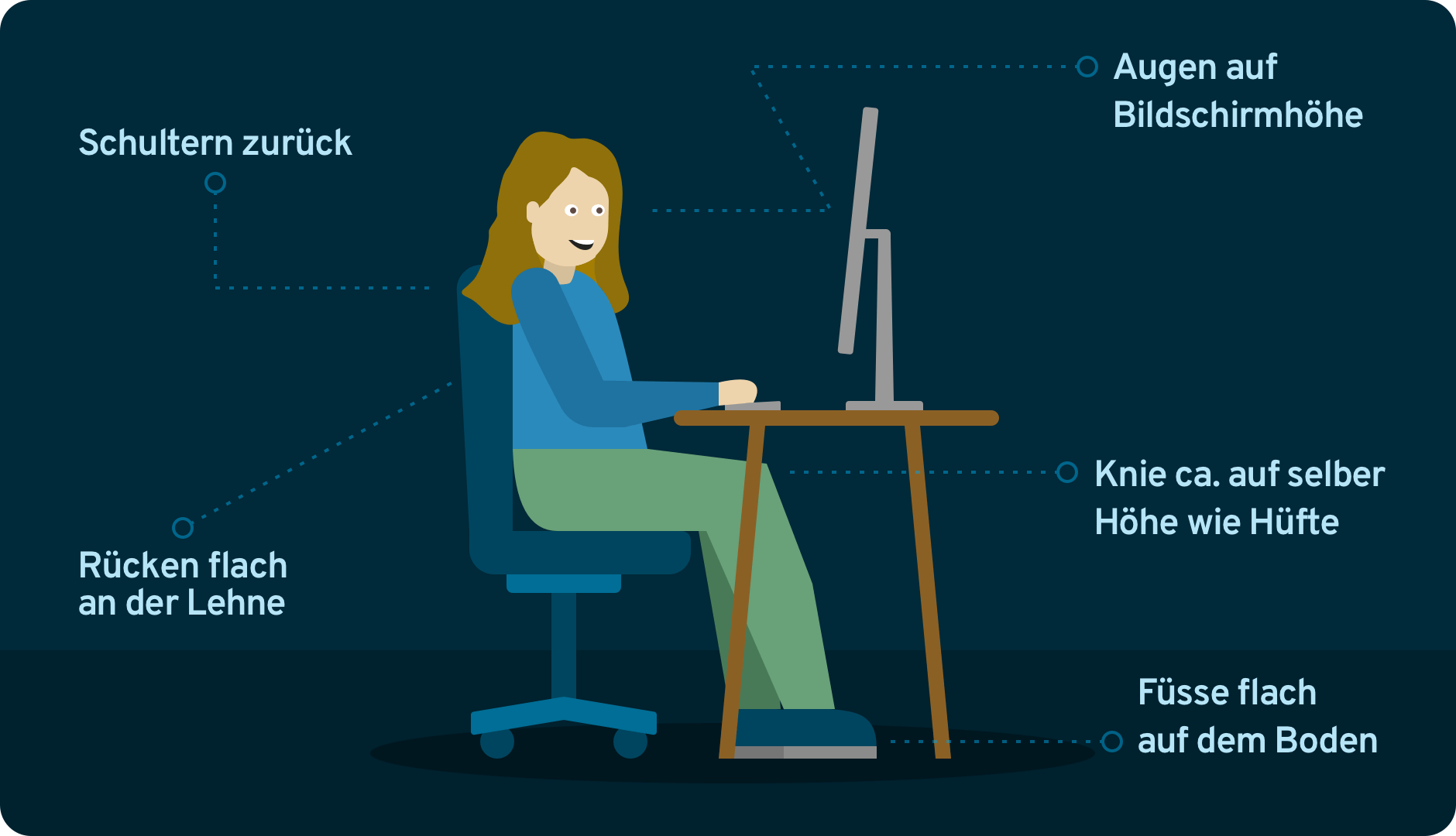 Dies gilt nicht nur für Menschen die viel Sitzen, sondern auch für jede andere Position die zu lange gehalten wird. „Wenn man viel sitzt, sollte man zirka stündlich aufstehen, ein paar Schritte gehen oder/und den Rücken in alle Richtungen durch bewegen.“ Ist das nicht möglich, sollte eine möglichst entlastende Haltung eingenommen werden. Dies bedeutet im Sitzen ein entspannter Schultergürtel, der obere Bildschirmrand auf Augenhöhe, die Knie rechtwinklig, der Rücken gerade und die Arme nicht zu weit nach vorne gestreckt. (Siehe Illustration) Wenn du am Stehpult arbeitest, ist es wichtig, dass du aufrecht stehst, deine Schultern locker nach hinten und unten fallen lässt, kein Hohlkreuz machst und deine Knie nicht ganz durchgestreckt sind. Zudem können eine weiche Matte oder Schuhe mit weicher Sohle hilfreich sein.