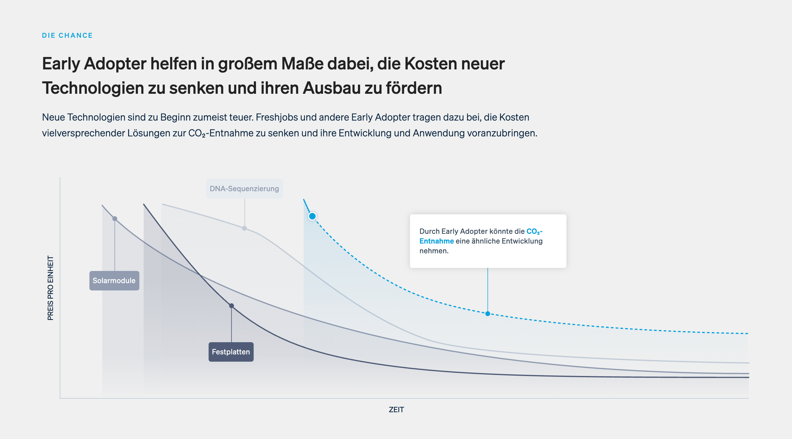 Mit Freshjobs unterstützen wir die Entwicklung von Technologien zur CO₂-Entnahme massgeblich, helfen, ihre Kosten zu senken und ihre Kapazität zu steigern. Lern- und Erfahrungskurven in der Produktion zeigen wiederholt, dass eine breite Nutzungsbasis gekoppelt mit Skaleneffekten signifikante Verbesserungen bewirkt. Dieses Phänomen ist bereits aus den Bereichen DNA-Sequenzierung, bei der Festplattenkapazität und im Hinblick auf Solarpanele bekannt.